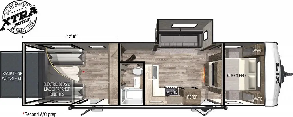 The 2022 Forest River XLR Hyper Lite 3212 is a toy hauler travel trailer that combines rugged utility with comfortable living space, making it a go‑to choice for weekend warriors and adventurers alike. With an overall length of about 36 ft 4 in and a generous fresh water capacity of 102 gallons, this model is designed to support extended trips and active lifestyles. It typically sleeps up to eight people, offering enough room for family, friends, or crew after a day of riding or exploring.